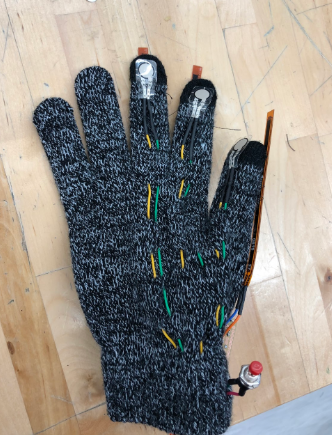 It does look a little rough around the edges but it was surprisingly comfortable to wear! The sensors were held onto the glove with a combination of thread and hot glue, but they stayed in place. The circuit board didn't interfere with any movement, probably due to us using non stranded wire.